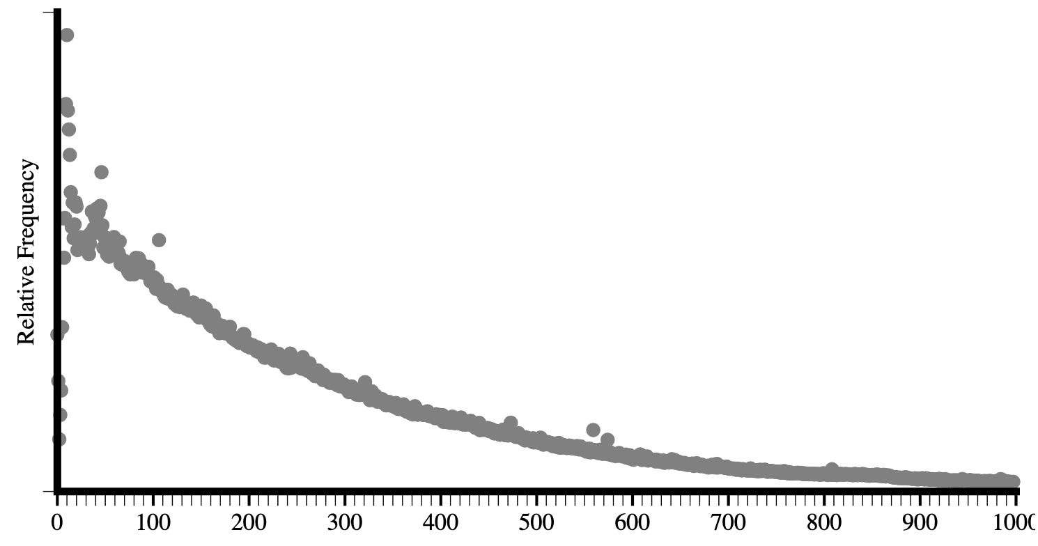 In Figure 3.7 above, the top 150 element names, counting the number of pages where they appear, are shown. Note how quickly use drops off.