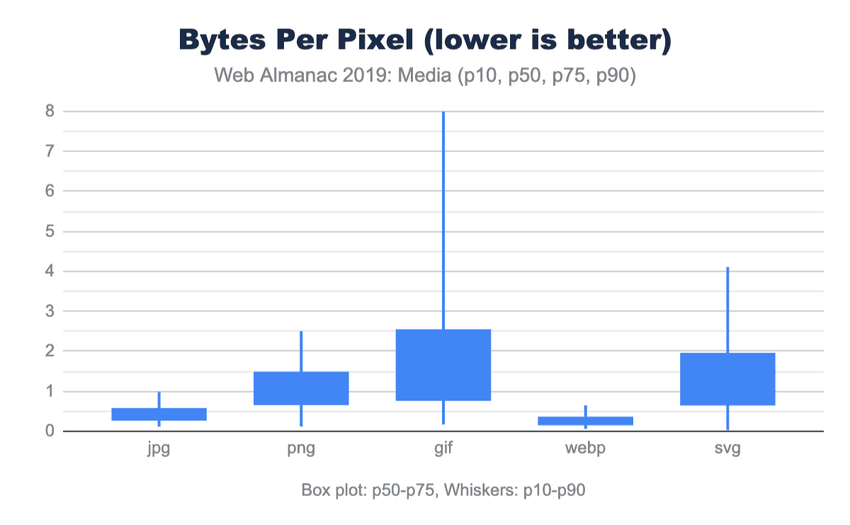 From this we can start to get a sense of how large or small a typical resource is on the web. However, this doesn’t give us a sense of the volume of pixels represented on screen for these file distributions. To do this we can divide each resource bytes by the natural pixel volume of the image. A lower bytes-per-pixel indicates a more efficient transmission of visual content.