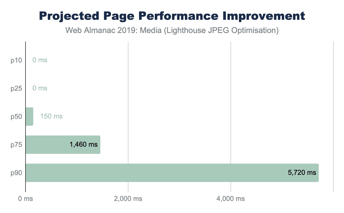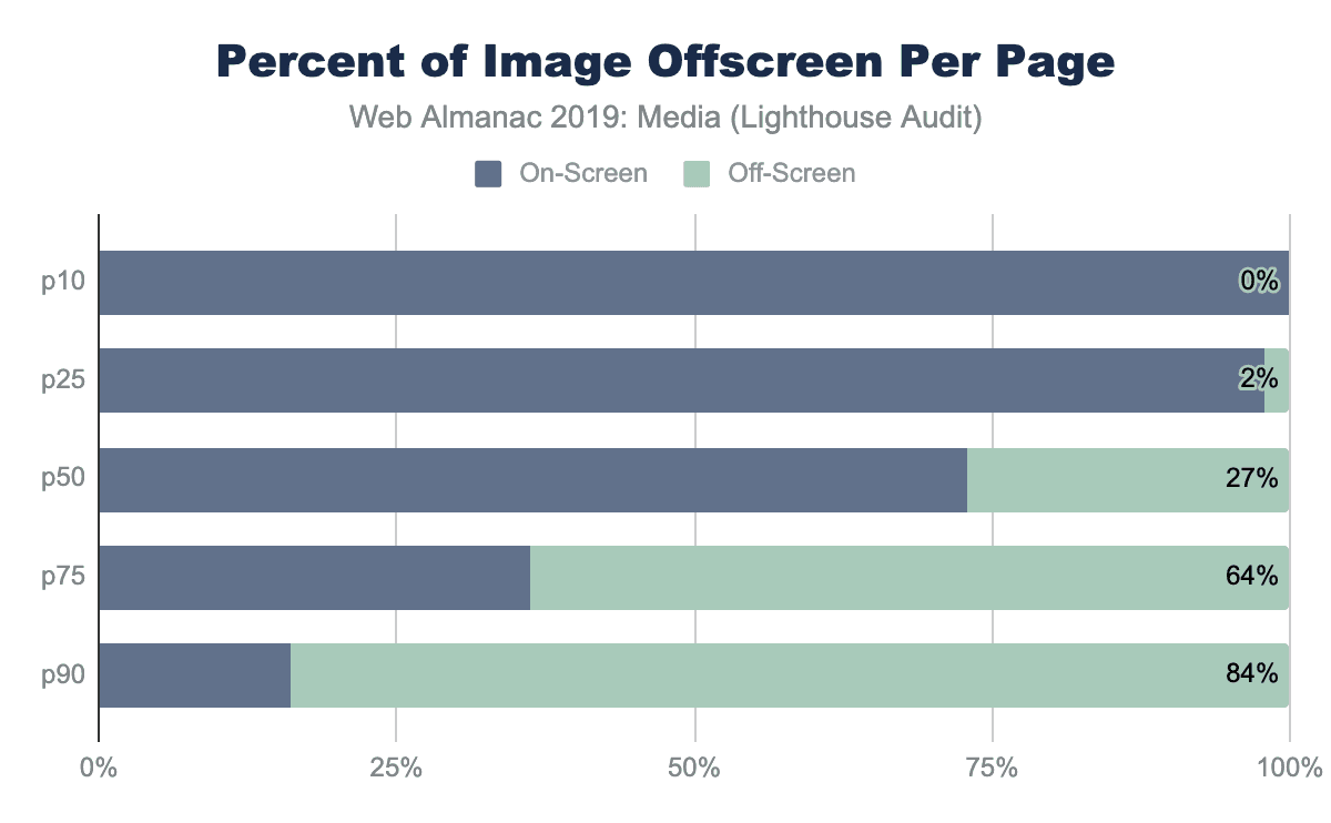 Earlier, in Figure 4.5, we showed that the volume of image content at the 75th percentile is far more than could theoretically be shown in a single desktop or mobile viewport. The offscreen images Lighthouse audit confirms this suspicion. The median web page has 27% of image content significantly below the fold. This grows to 84% at the 90th percentile.