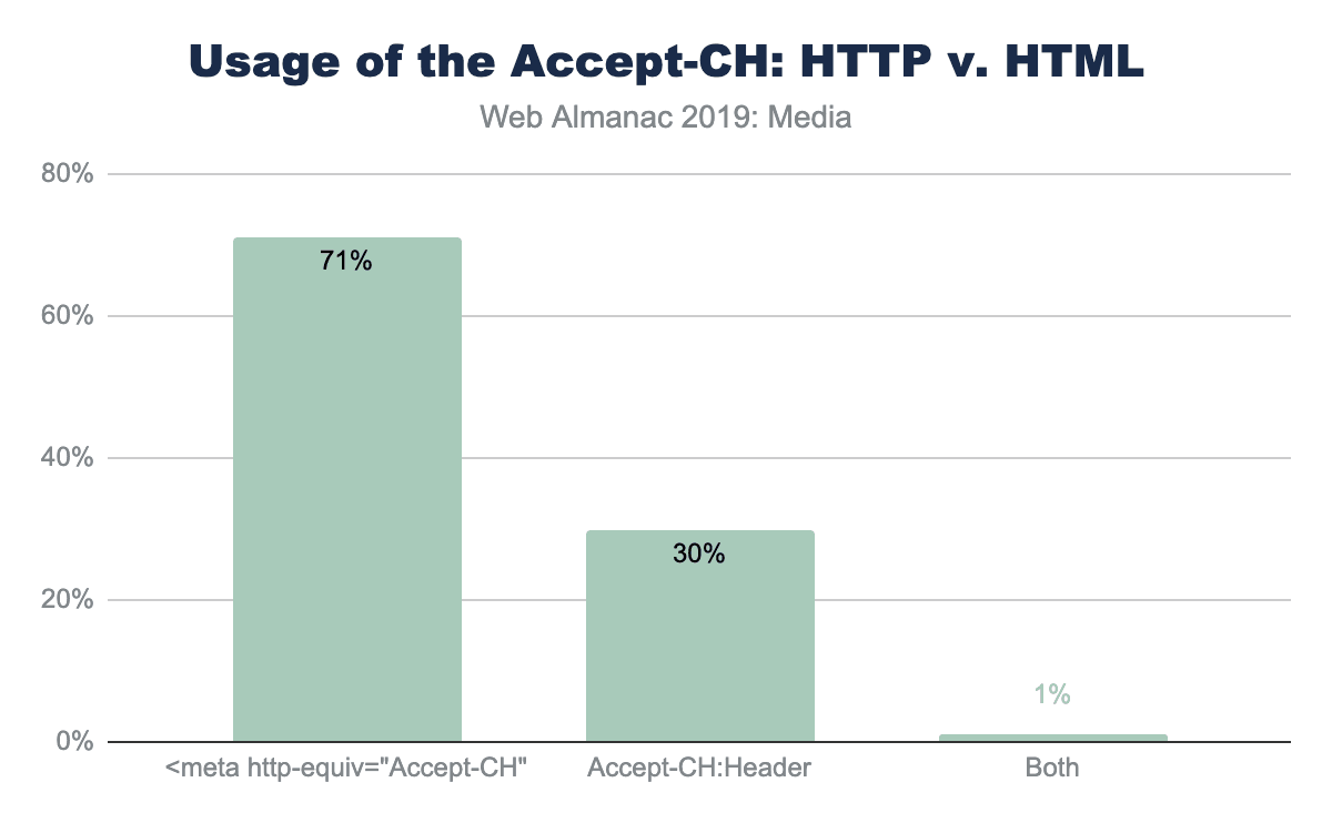 The use of the <meta> tag in HTML to invoke Client Hints is far more common compared with the HTTP header. This is likely a reflection of the convenience to modify markup templates compared to adding HTTP headers in middle boxes. However, looking at the usage of the HTTP header, over 50% of these cases are from a single SaaS platform (Mercado).