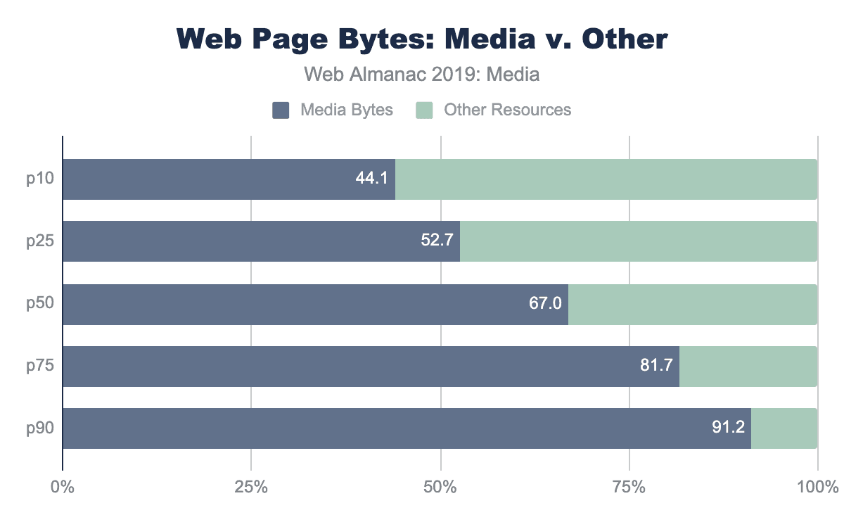 From a pure bytes perspective, HTTP Archive has historically reported an average of two-thirds of resource bytes associated from media. From a distribution perspective, we can see that virtually every web page depends on images and videos. Even at the tenth percentile, we see that 44% of the bytes are from media and can rise to 91% of the total bytes at the 90th percentile of pages.