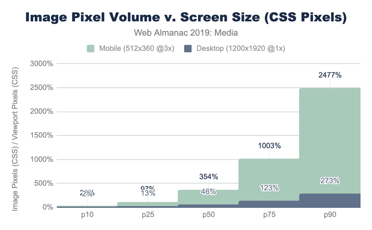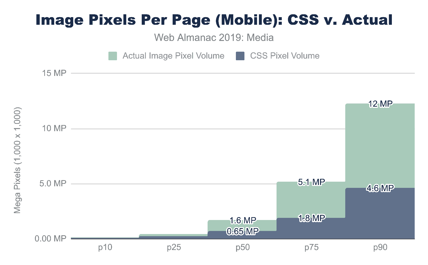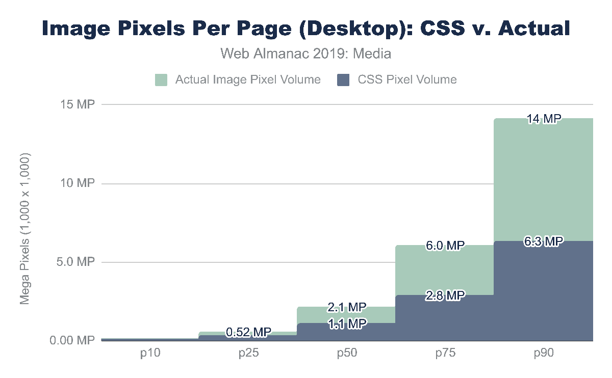 In contrast, the natural, or file, pixel volume is between 2 and 2.6 times the layout volume. The median desktop web page sends 2.1MP of pixel content that is displayed in 1.1 MP of layout space. At the 90th percentile for mobile we see 12 MP squeezed into 4.6 MP.