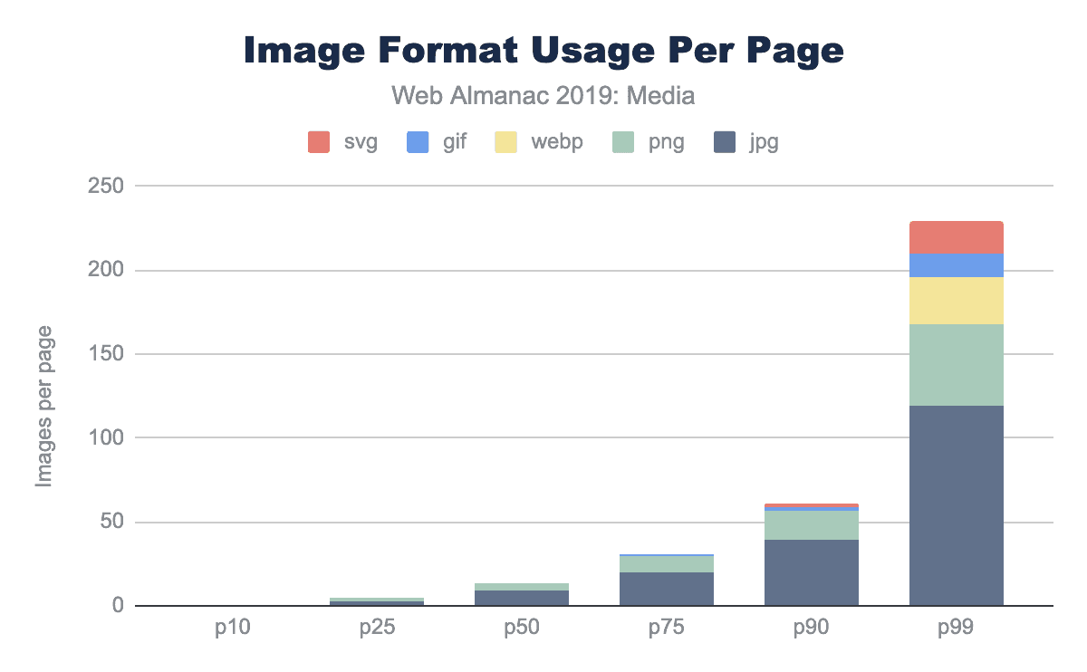 While the median page has nine JPEGs and four PNGs, and only in the top 25% pages GIFs were used, this doesn’t report the adoption rate. The use and frequency of each format per page doesn’t provide insight into the adoption of the more modern formats. Specifically, what percent of pages include at least one image in each format?