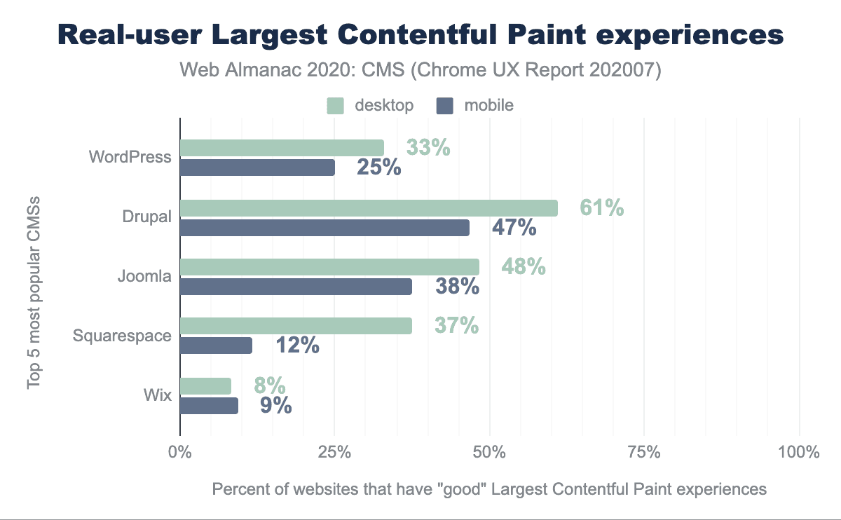 Even though we’d love to see CMSs performing much better here, there are still some positive takeaways from these results. For one, the fact that 61% of Drupal websites have good LCP is especially notable because it’s much better than the global distribution of 48% of websites having good LCP, according to the Chrome UX Report. For 1 in 3 or 4 WordPress websites to have good LCP is also kind of amazing, given the sheer magnitude of the number of WordPress websites. Wix does have some catching up to do, but it’s encouraging to see that Wix engineers are actively working on fixing performance issues, so this will be something to keep an eye on over the years.