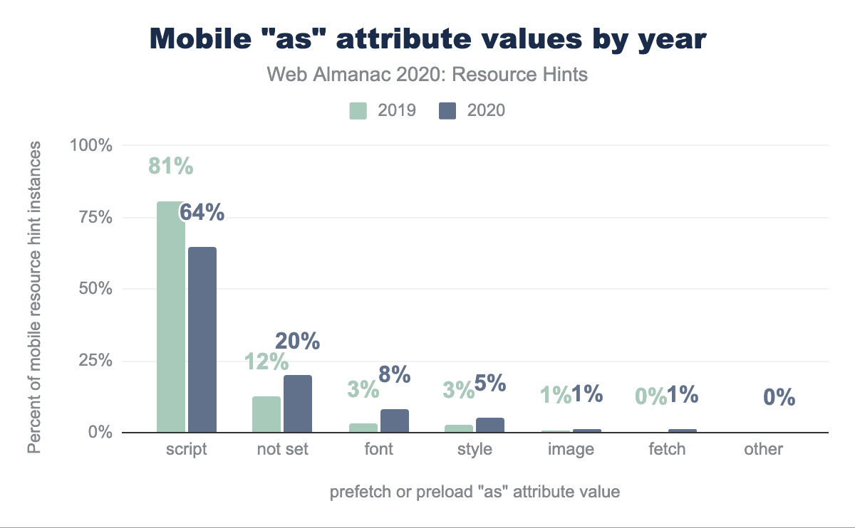 as attribute values on mobile pages from 2019 and 2020, broken down by as attribute value. The majority of as values are script with 81% usage in 2019 and 64% usage in 2020. script usage fell 17% year over year, while all other values increased in usage. not set increased 8%, font increased 5%, style increased 2%, the rest of the notable values are 1% or less for both years.as attribute values by year.
