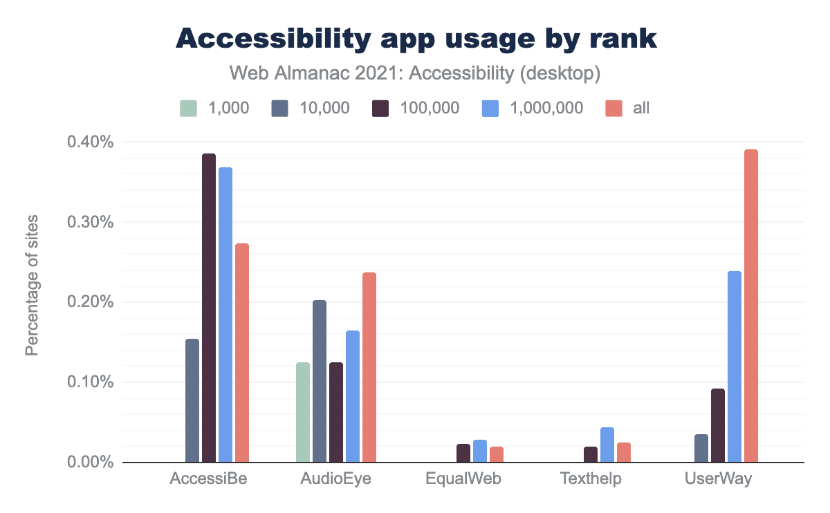When considering domain rank, the top 1,000 websites have a lower percentage —0.1%— of overlay usage. However, considering the reach of these top-ranking sites, the potential impact of even one website with this much traffic using an overlay is very substantial.