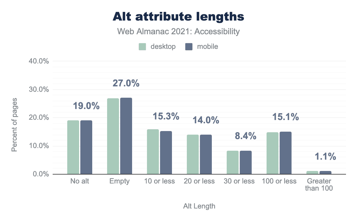 alt is set on 19.1% of desktop images and 19.0% of mobile images, it is set to empty on 26.9% and 27.0% respectively, it is 10 characters or less on 15.9% and 15.3%, 20 characters or less on 13.9% and 14.0%, 30 characters or less on 8.2% and 8.4%,100 characters or less on 14.8% and 15.1%, and it is greater than 100 characters on 1.1% and 1.1%.alt attribute lengths.