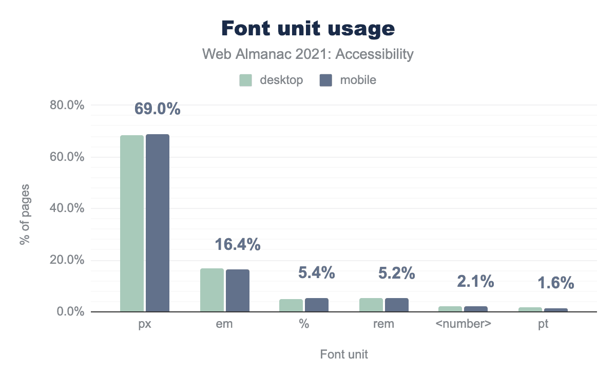When fonts are declared in px units, they are static sizes. The best way to ensure that fonts scale appropriately when the browser is zoomed is to use relative units such as em and rem. We found that 68% of desktop font size declarations are set in px, 17% are set in em and 5% are set with rem units.