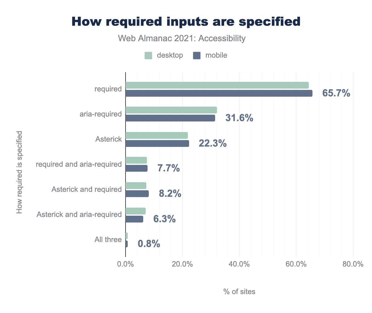 aria-label attribute is used for 20.7% and 22.2% respectively, there is no accessible name for 17.5% and 19.9%, the value attribute is used for 9.2% and 8.1%, title attribute is used for 2.6% and 2.5%, an aria-labelledby related element is used for 0.1% and 0.1%.We found that 57% of buttons on both desktop and mobile sites get their accessible name from content. We also found that 29% of buttons on desktop sites and 27% of buttons on mobile sites get their accessible names from the aria-label attribute.