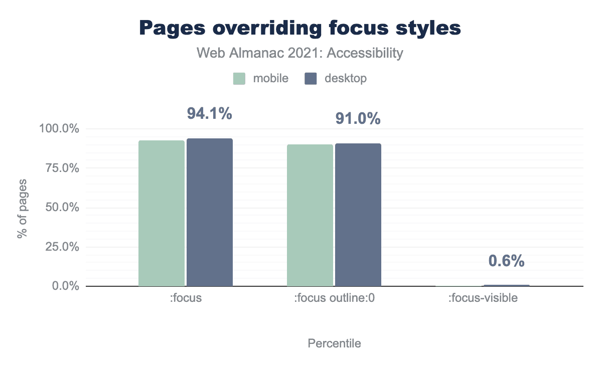 :focus pseudo class, and 90.0% of desktop sites and 91.0% of mobile sites use that :focus pseudo class to set the outline to 0 or none. 0.6% of desktop sites and 0.6% of mobile sites use the :focus-visible pseudo class.Often times, default focus indication is removed from interactive content such as buttons, form controls, and links using the CSS property :focus { outline: none; } or :focus { outline: 0; }, sometimes in conjunction with :focus-within and/or :focus-visible. We found that 91% of desktop pages have :focus { outline: 0; } declared. In some cases, it is removed so that a more effective custom style can be applied. Unfortunately, in many cases it is simply removed and never replaced, which can render a page unusable for keyboard users.