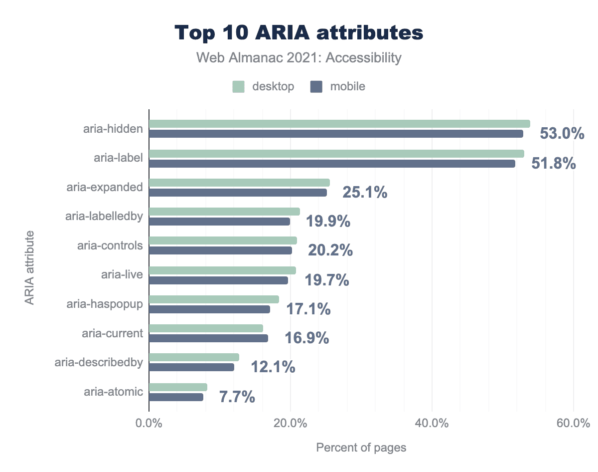 We found that 54% of desktop pages (up from 48% in 2020) and 53% of mobile pages (up from 49% in 2020) had at least one instance of an element with the aria-hidden attribute.