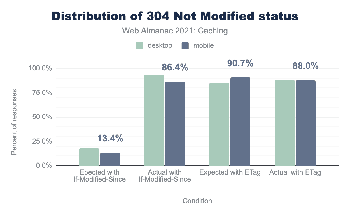 If-Modified-Since, 94% for Actual with If-Modified-Since, 84% for Expected with ETag, and 88% for Actual with ETag. Usage for mobile ranges from 13% for Expected with If-Modified-Since, 86% for Actual with If-Modified-Since, 91% for Expected with ETag, and 88% for Actual with ETag We saw the distribution of 304 responses increase by 7.7% for If-Modified-Since between 2020 and 2021. This shows that the community is capitalizing on these data savings.