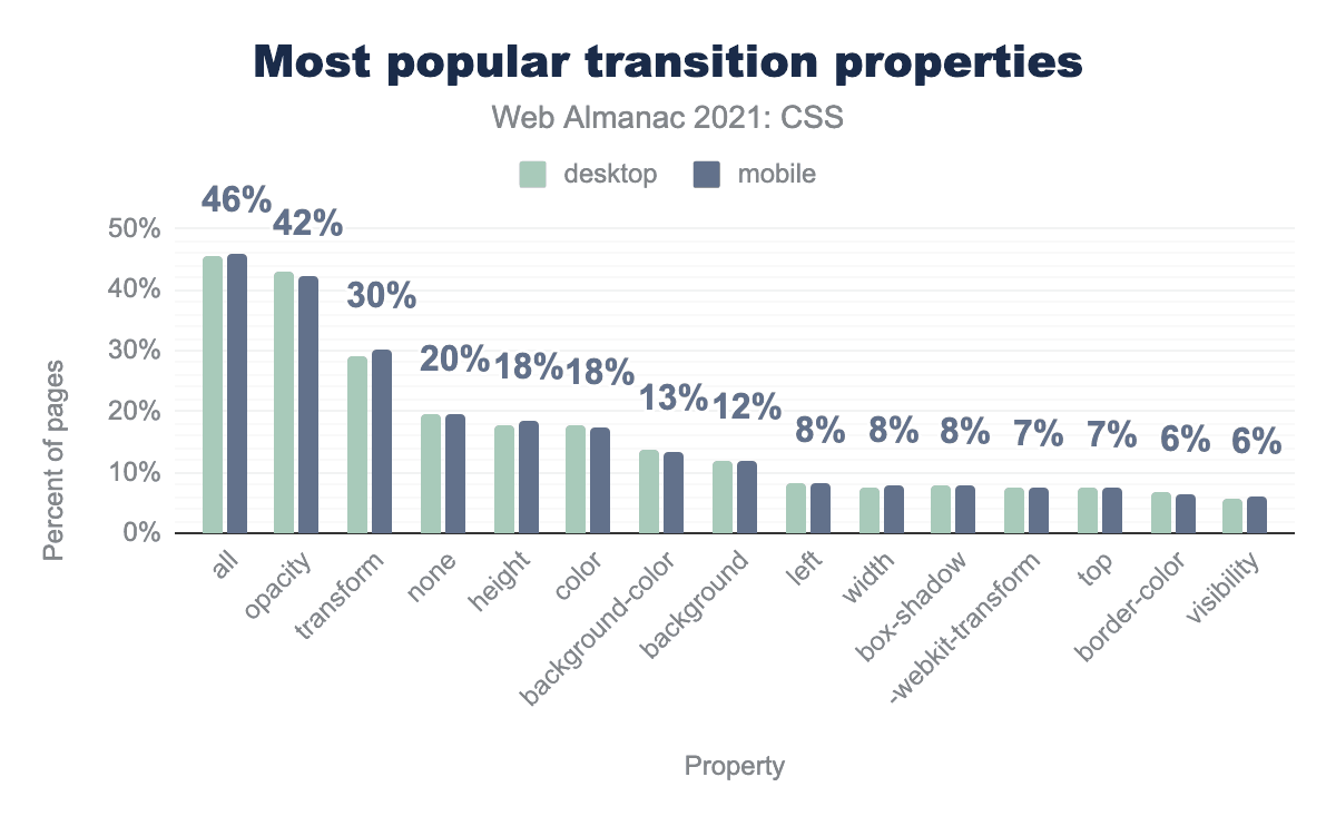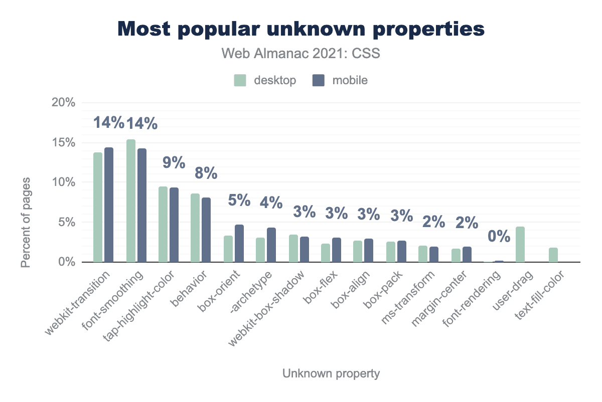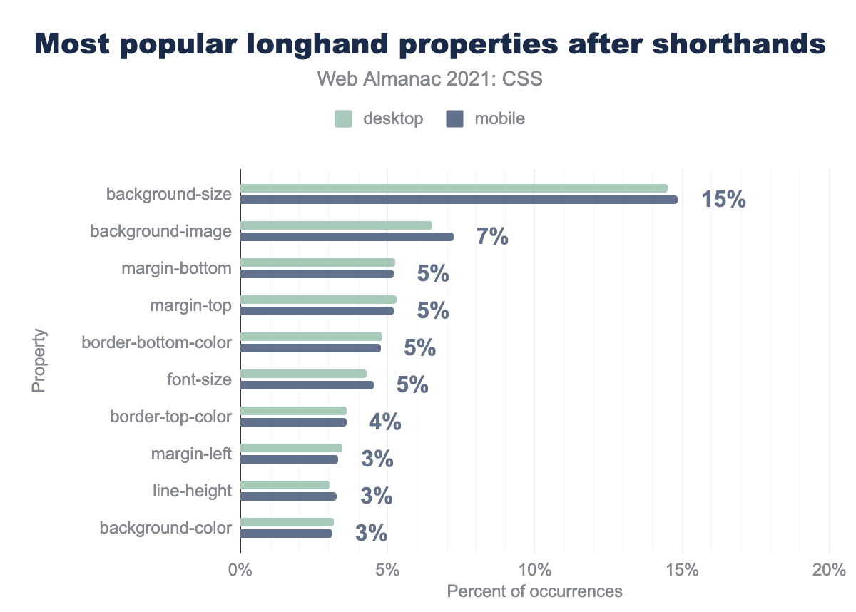 As in 2020, the winner was background-size, although last year it showed up in 41% of such cases on mobile, and this year was seen in only 15% of such cases.