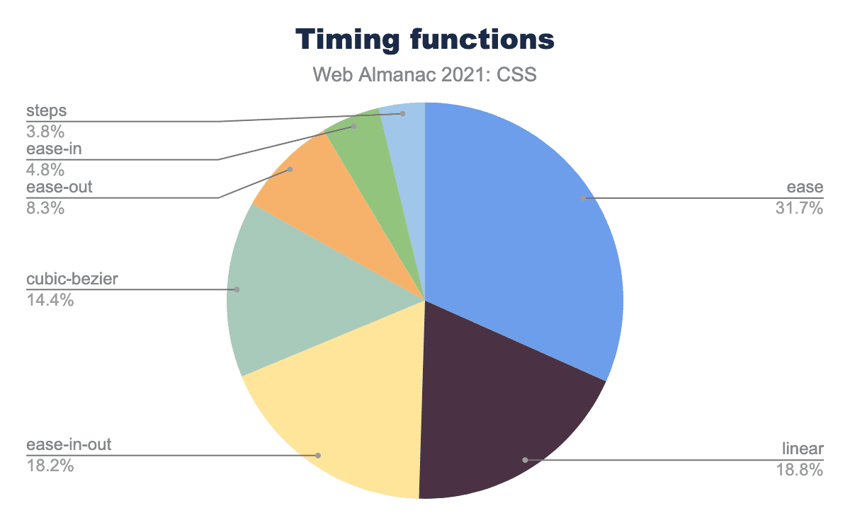 The ranking and distribution of both pseudo-classes and pseudo-elements was not greatly changed from the 2020 Web Almanac. A few rankings changed, but overall, things seemed highly static. Whether this represents a solidification of common practice, a snapshot of designer interests, or simply the nature of the analysis, is open to debate.