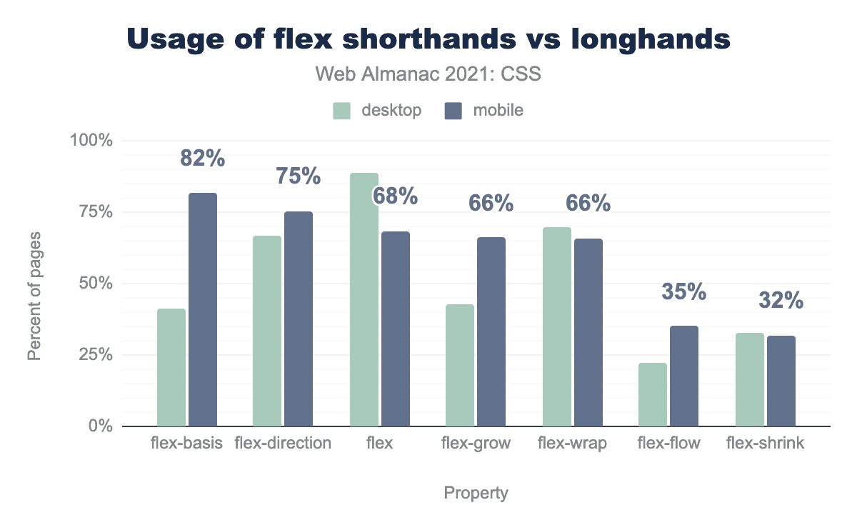 Some of the Flexbox longhand and shorthand properties have had a turbulent history; for example, the CSS Flexbox specification itself recommends that authors avoid using flex-grow, flex-shrink, and flex-basis and use the flex shorthand instead. This ensures that unset properties have sensible values. Unfortunately, this doesn’t seem to be bearing out in the wild, where flex-basis is used more often on mobile pages than is flex, by a margin of more than 10%.