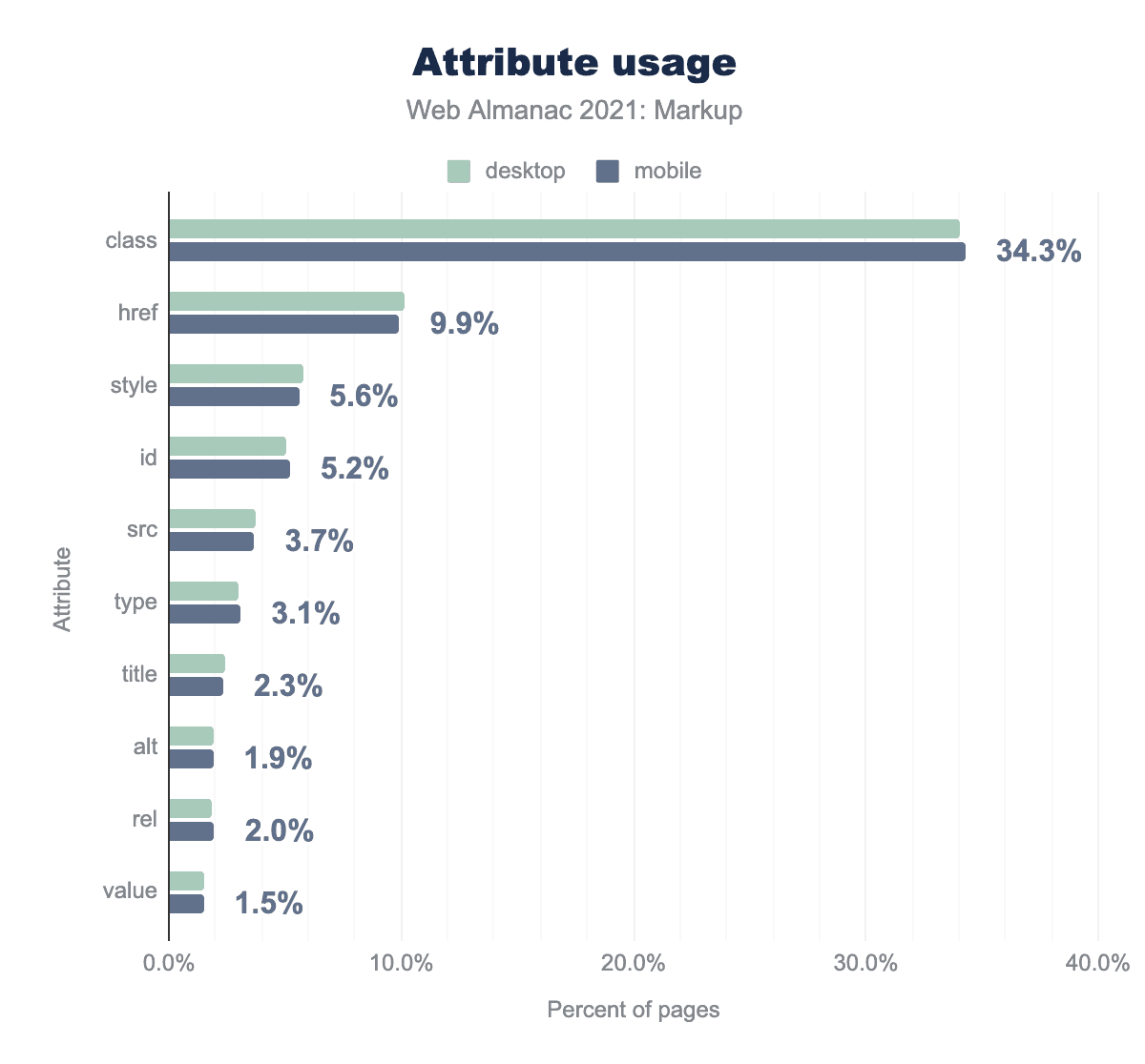The most popular attribute is class and that’s no surprise, given that it’s used for styling. 34.3% of all the attributes found on the pages we queried were class. By contrast, id was much less used, at 5.2%. It’s interesting to note that the style attribute edged out the id attribute in popularity, accounting for 5.6% of occurrences.