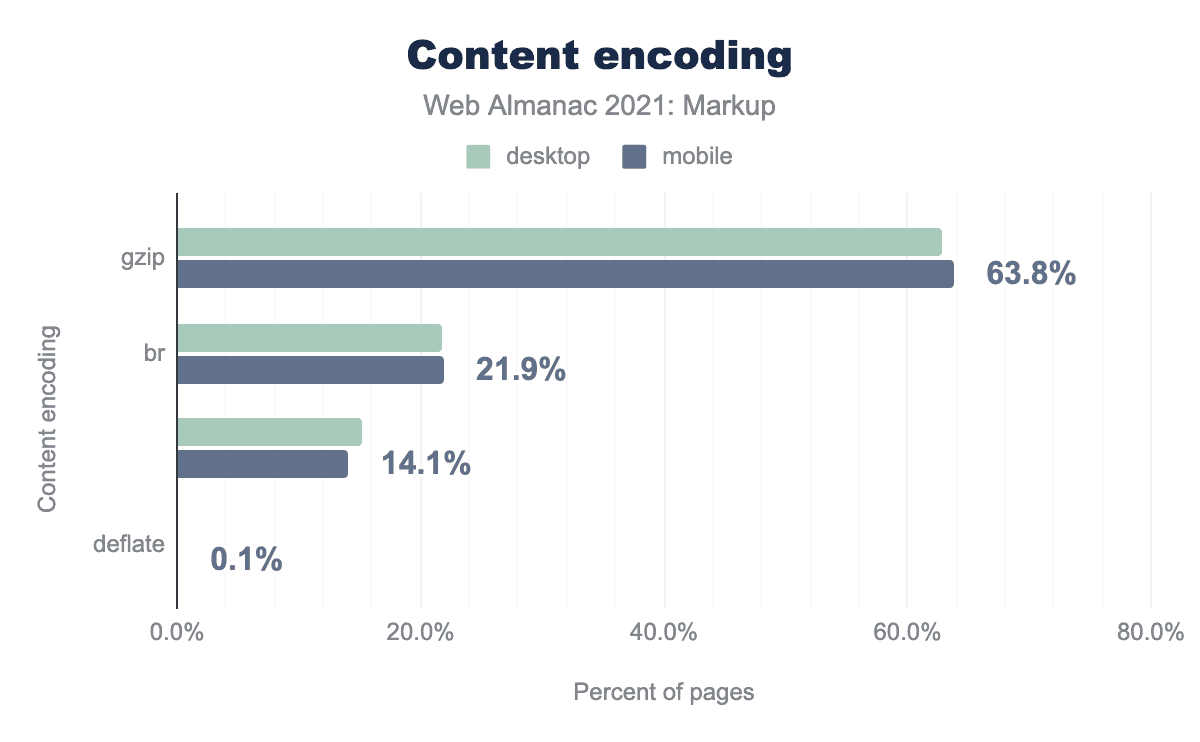 Out of the 6 million desktop pages scanned, an overwhelming 84.4% were compressed with either gzip (62.7%) or Brotli (21.7%) compression. For mobile pages, the numbers are very similar, 85.6% were compressed with either gzip (63.7%) or Brotli (21.9%) compression. The slight variation in percentages for mobile and desktop is not surprising, as they comprise of different URLs, and the Mobile data set is a lot larger.
