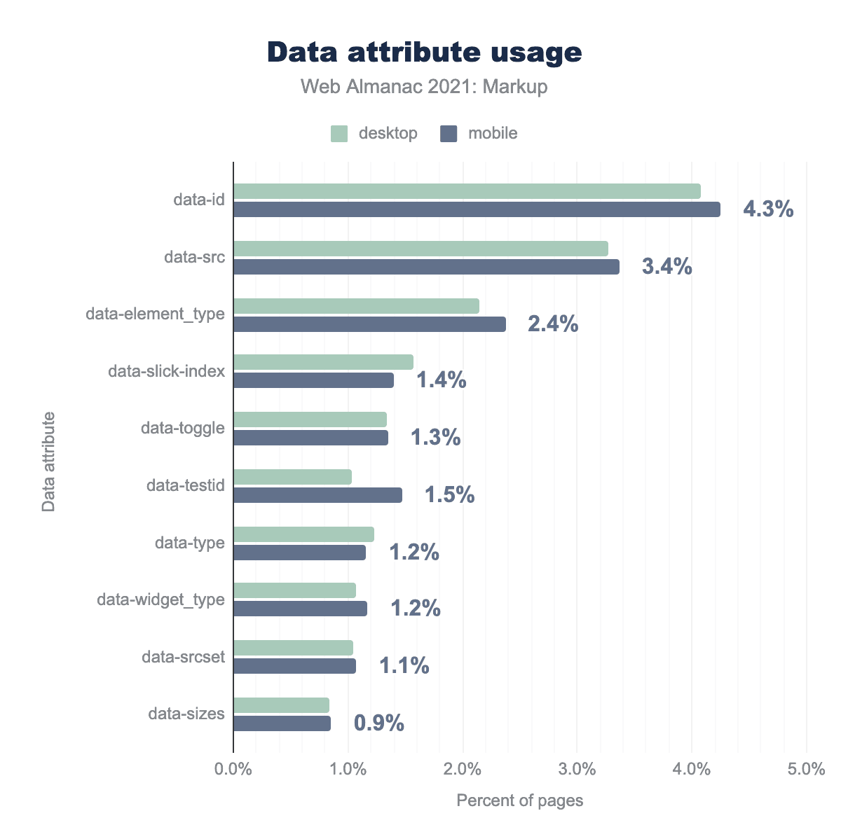 Element behaviors are heavily influenced by attributes, so we thought it was only fair we took a look at the attributes used on a page, explore data-* patterns, and some popular social attributes for meta elements.