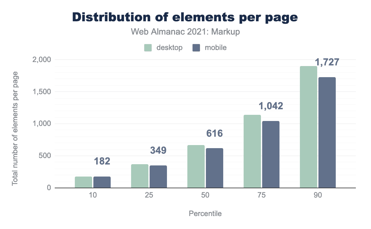 While the median page had 666 elements on desktop, and 616 on mobile, the top 10% of all pages had closer to triple that number, 1,727 for mobile and 1,902 for desktop.