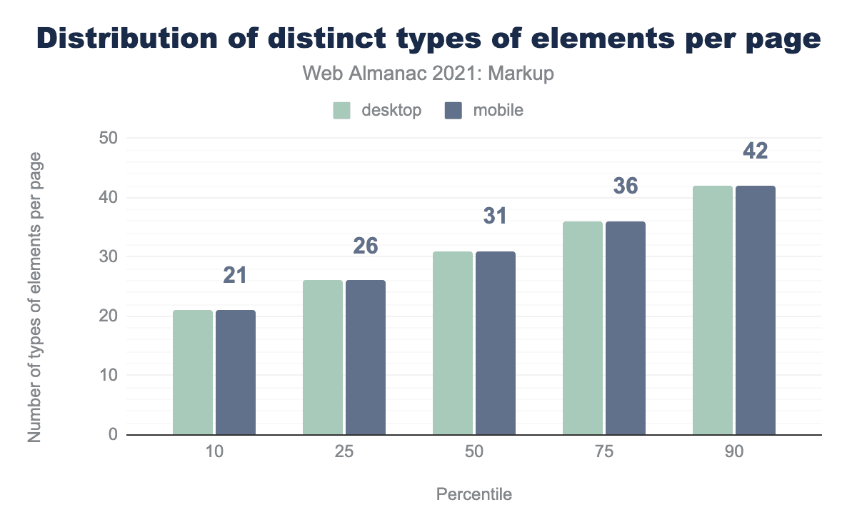 No need to panic, the web isn’t all made up of divs. The median mobile page uses 31 different elements and has a total of 616 elements.