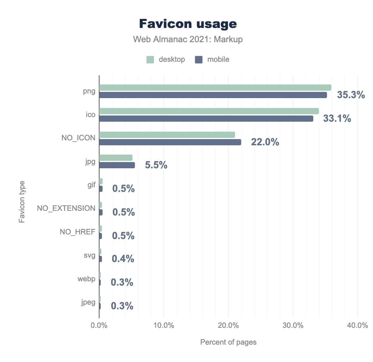 It was great to see ICO finally being dethroned as the most popular favicon format in favor of PNG. Similarly, seeing SVG more than doubling in usage for favicons in the past year made us think we’re 10 years away from dethroning PNG.