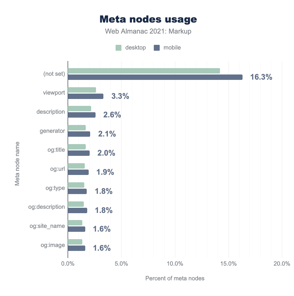 From the available attributes, name (paired with content) was the most popular. 14.2% of the meta elements did not have a name attribute. In conjunction with the content attribute, they are used as a key-value pair for passing in information. What information, you ask?