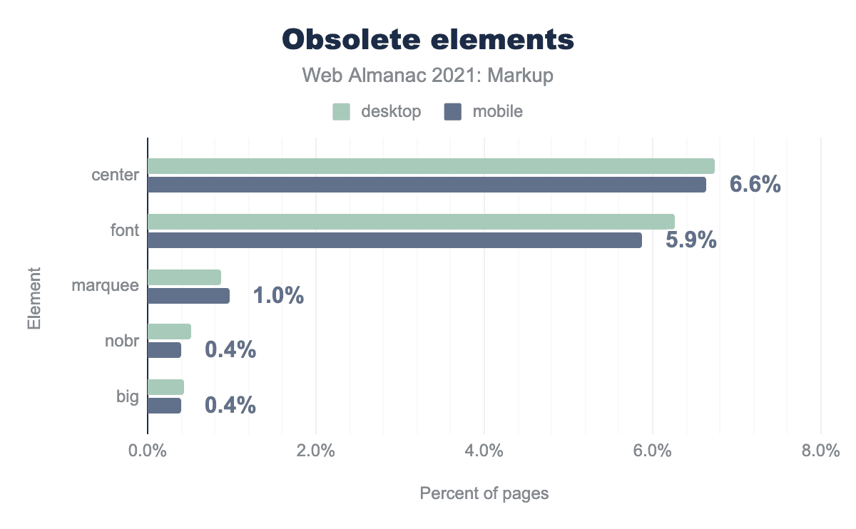 The surprising part is that, almost 20 years later, XHTML is still a considerable part of the web, with 8% of pages still using it on desktop and a little under 7% on mobile.
