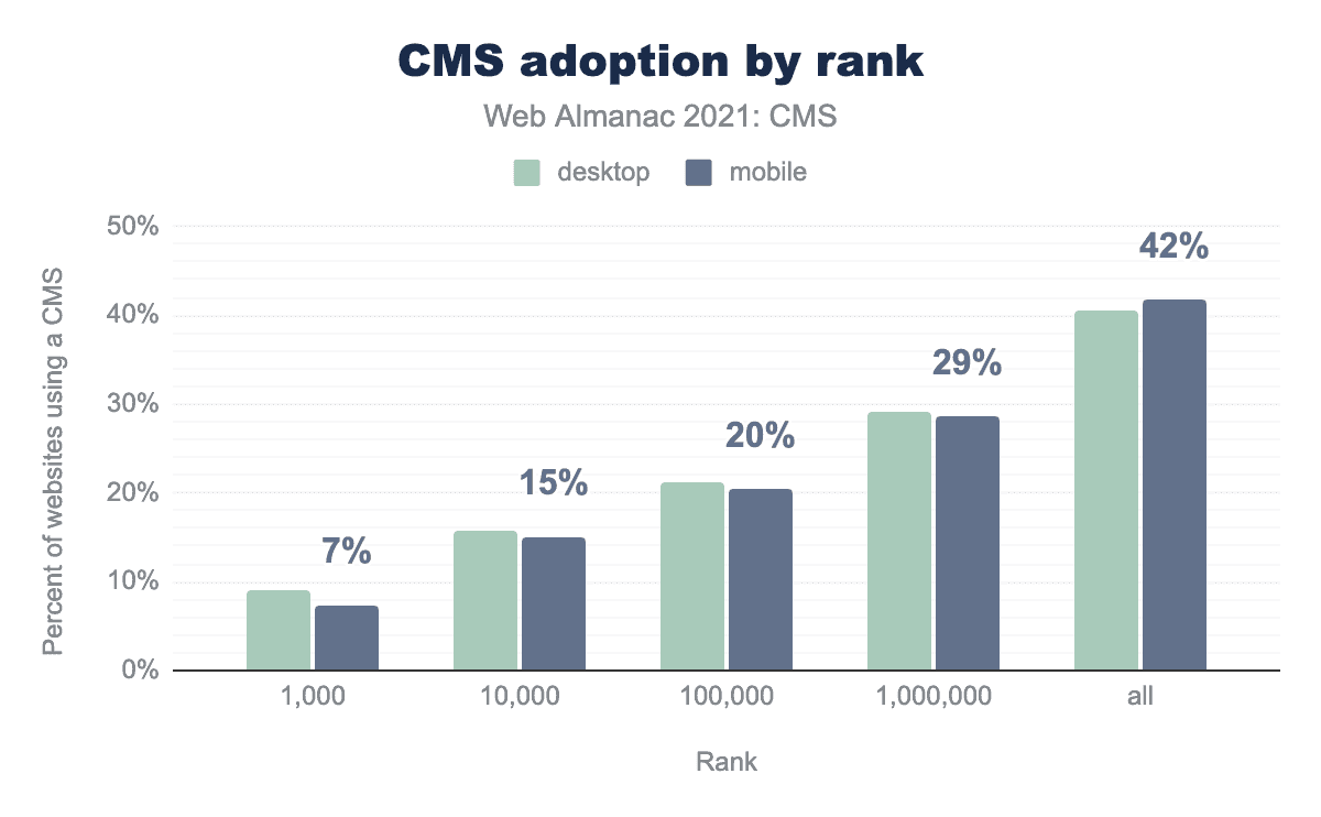 42% of pages (mobile) in the “all” group used a CMS whereas the top 1,000 sites only had 7% adoption.