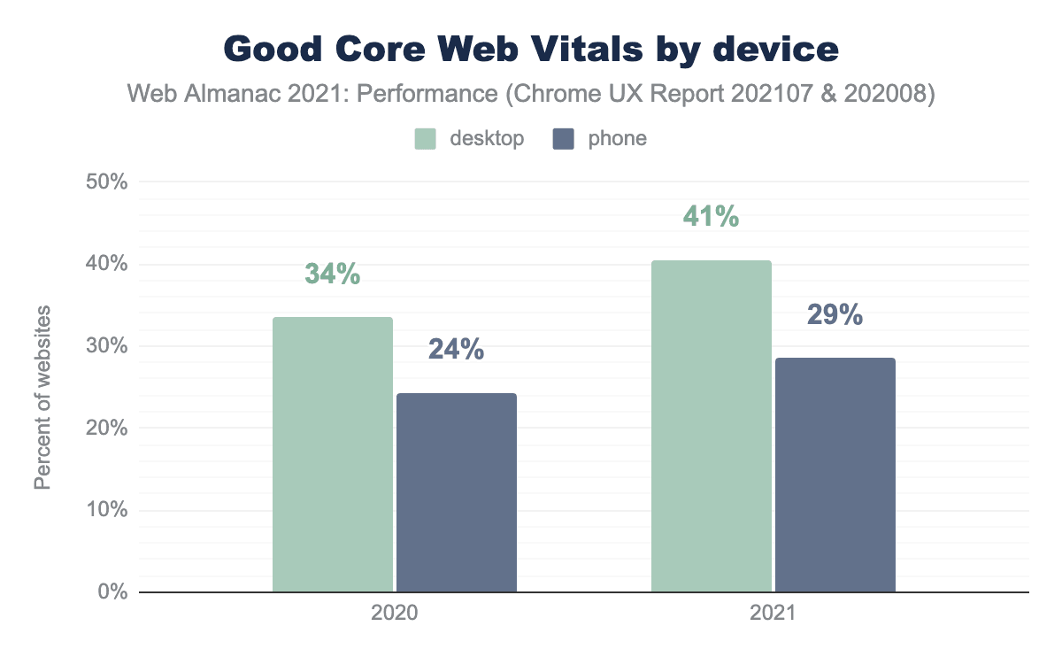 Figure 10.1. Good Core Web Vitals by Device from 2020 to 2021.