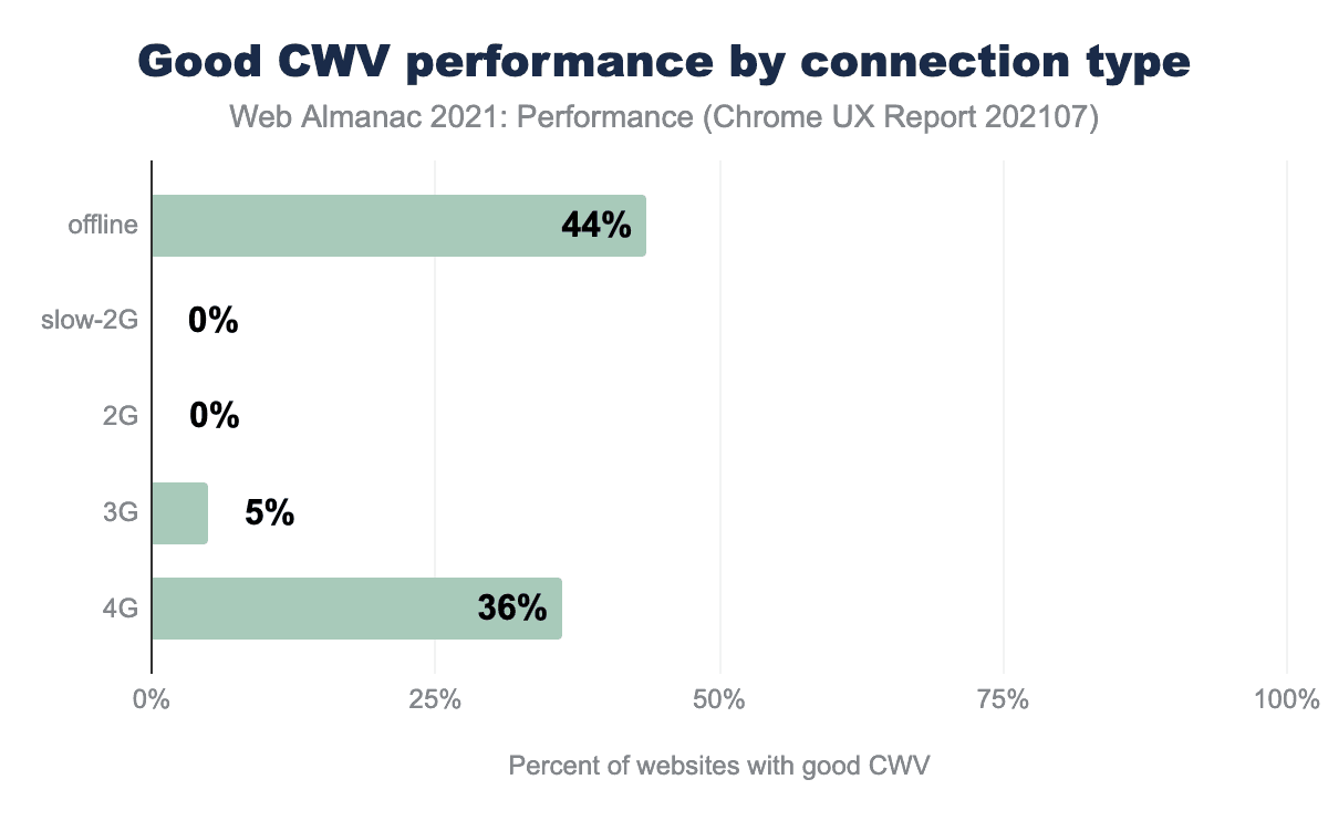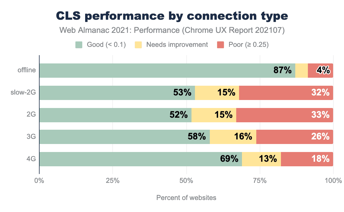Offline websites had the highest CLS performance of all connection types. For sites with service worker caching, some assets like images and ads that would otherwise cause layout shifts may not be cached. Thus, they would never load and never cause a layout shift. Often fallback HTML for these sites can be more basic versions of the online website.