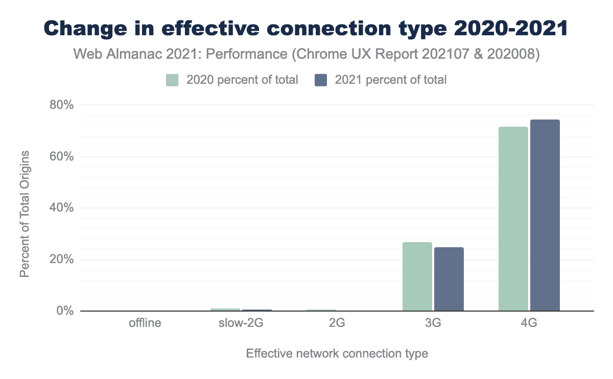 Earlier, we mentioned year-over-year improvements in LCP and FID improvements. These could be partly due to faster mobile devices and mobile networks. The chart above shows total origins accessed on 3G dropped by 2 percentage points while 4G access increased by 3 percentage points. Percent of origins is not necessarily correlated with traffic. But, I would guess if people have more access to higher speeds, then more origins would be accessed from that connection type.