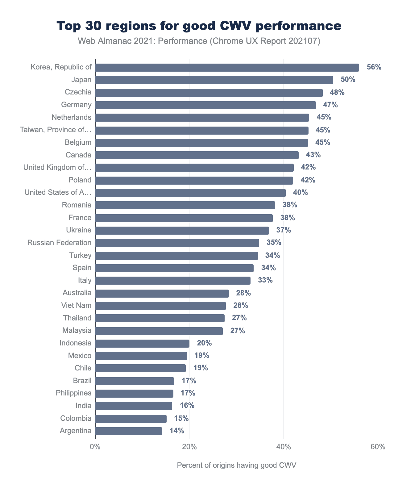 CrUX data is only gathered in Chrome. The percent of origins by country does not align with relative population sizes. Reasons may include differences in browser share, in-app browsing, device share, level of access, and level of use. Keep these caveats in mind when evaluating regional-level differences and context for all CrUX analyses.