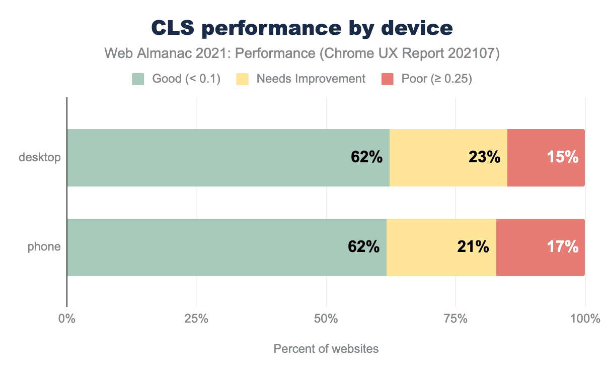 Cumulative Layout Shift (CLS) is characterized by how much layout shift a user experiences, not how long it takes to visually see something like FCP and LCP. As such, performance by device was fairly equivalent.
