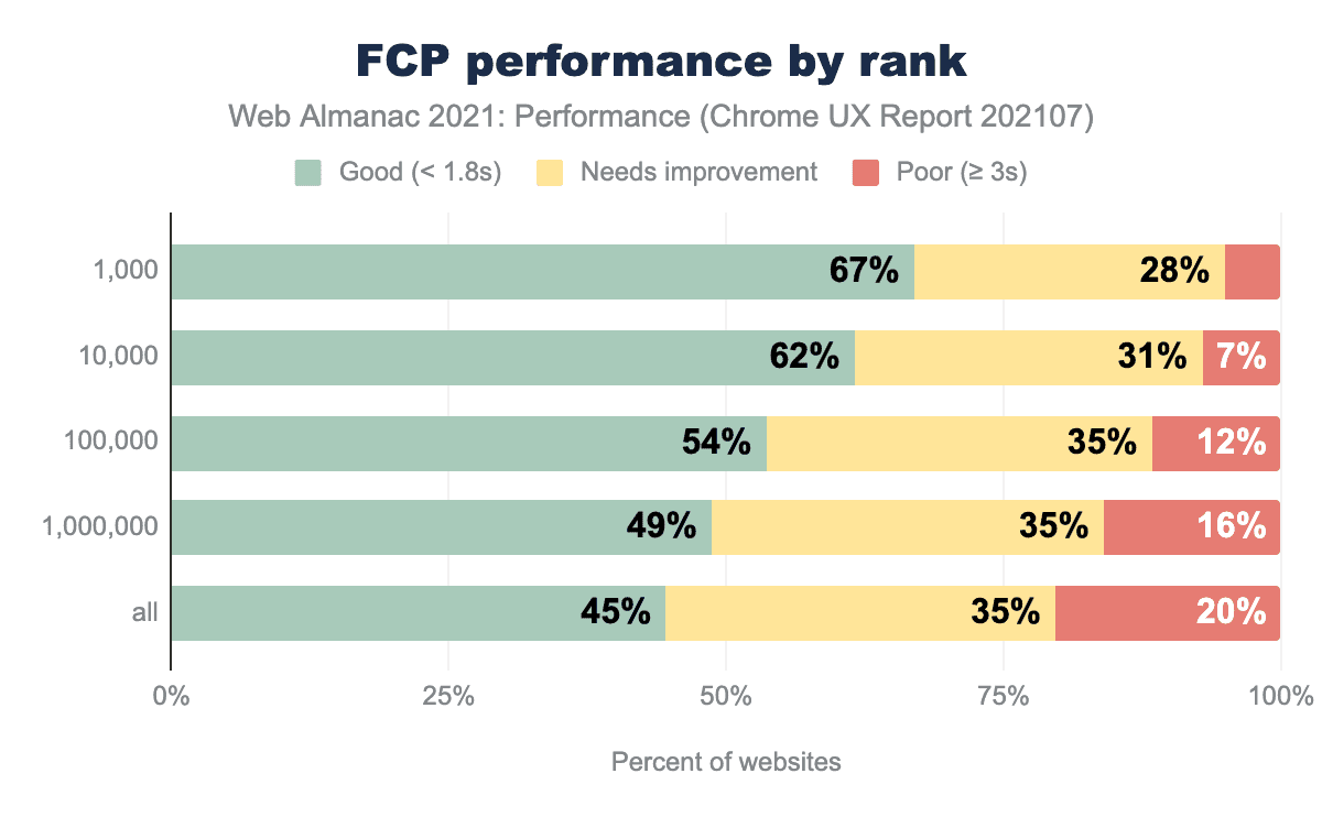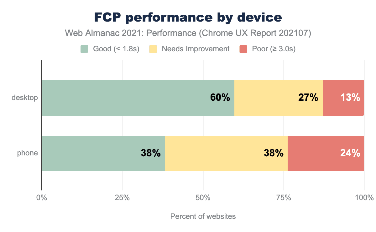 FCP was faster on desktop than mobile, likely due to both faster average network speeds and faster processors. Only 38% of origins had good FCP on mobile. Render-blocking resources such as synchronous JavaScript can be a common culprit. Because TTFB is the first part of FCP, poor TTFB will make it difficult to achieve a good FCP.