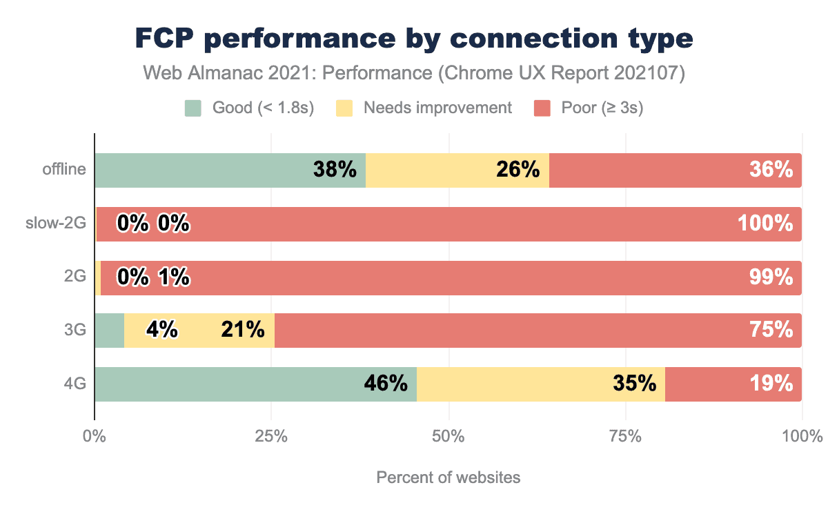 Offline origins with good LCP more closely matched 4G experiences, though poor LCP experiences were higher for offline. LCP occurs after FCP, and the additional budget of 0.7 seconds could be why more offline websites achieved good LCP than FCP.