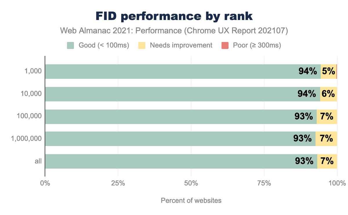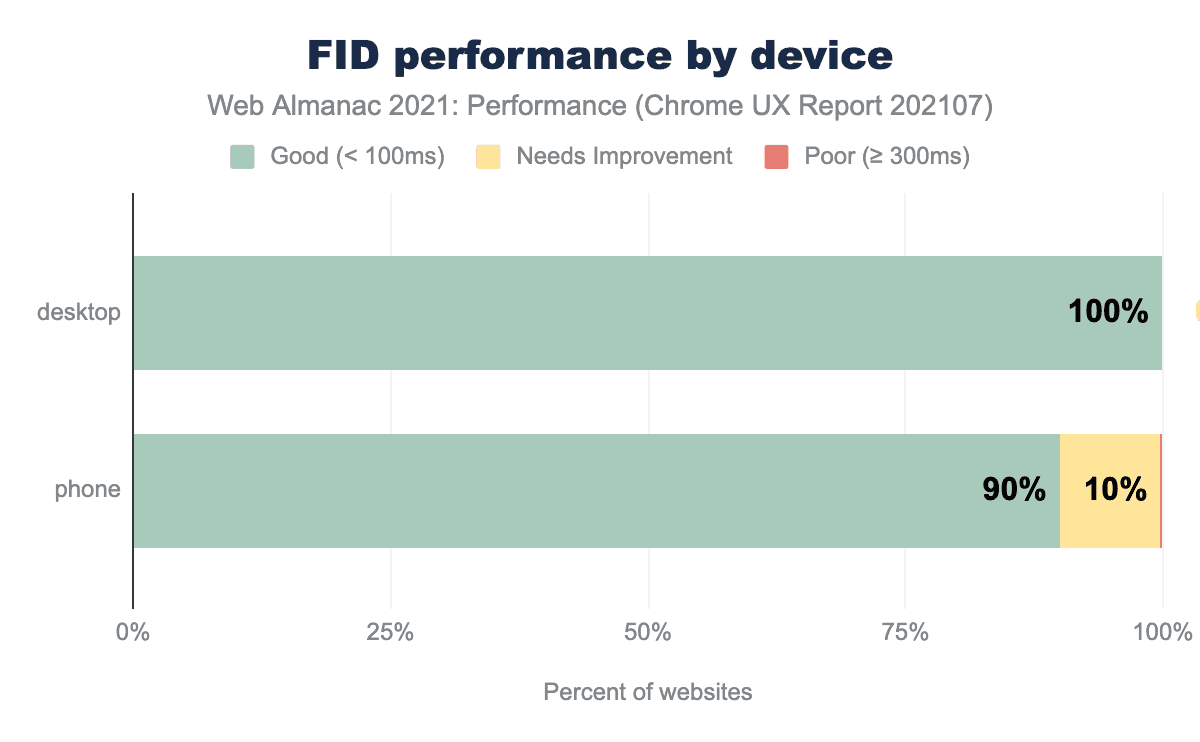 FID performance was better on desktop than on mobile devices likely due to device speeds which can better handle larger amounts of JavaScript.