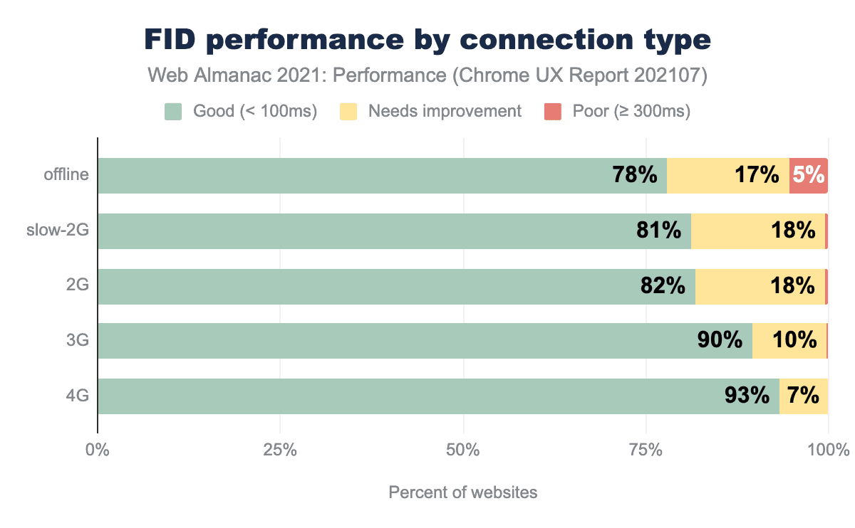 Unlike the other metrics, FID was worse for offline websites than any other connection category. This could be due to the more complex nature of many websites with service workers. Having a service worker does not eliminate the impact of client-side JavaScript running on the main thread.