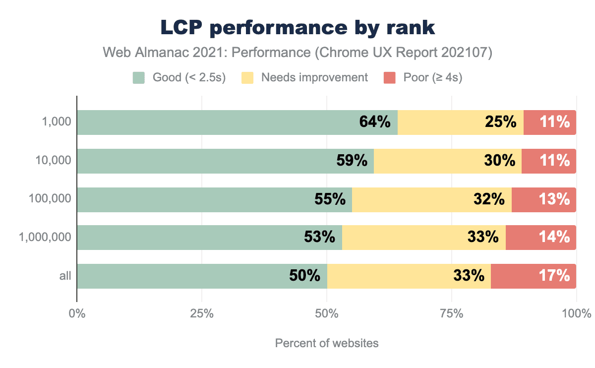 This year for the first time, we have ranking data! ​​CrUX determines ranking by the number of page views per website measured in Chrome. In the charts, the categories are additive. The top 10,000 sites include the top 1,000 sites, and so forth. See the methodology for more details.