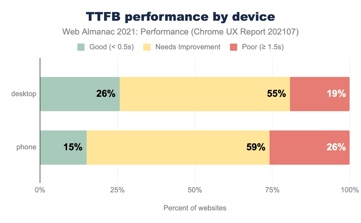 TTFB was faster on desktop than mobile, presumably because of faster network speeds. Compared to last year, TTFB marginally improved on desktop and slowed on mobile.