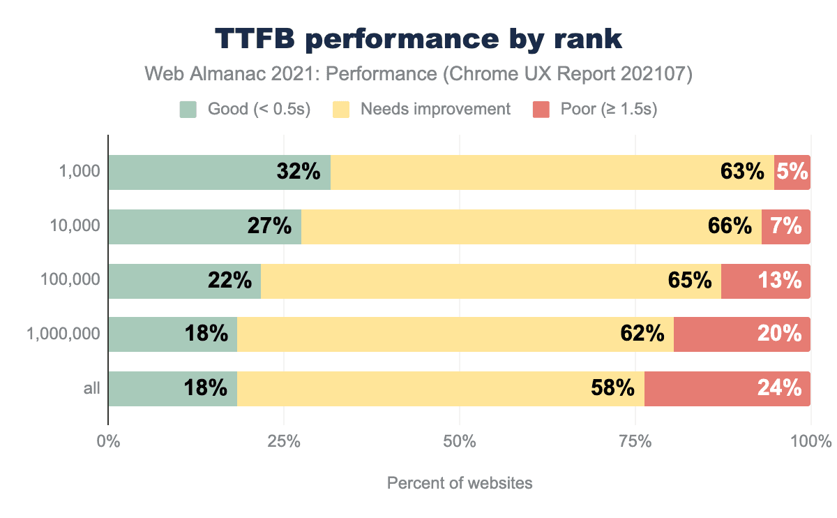 Only 5% of origins on WordPress experienced good TTFB in July 2021. Considering WordPress’s large share of the top 10M sites, its poor TTFB could be a contributor to the TTFB degradation by rank.