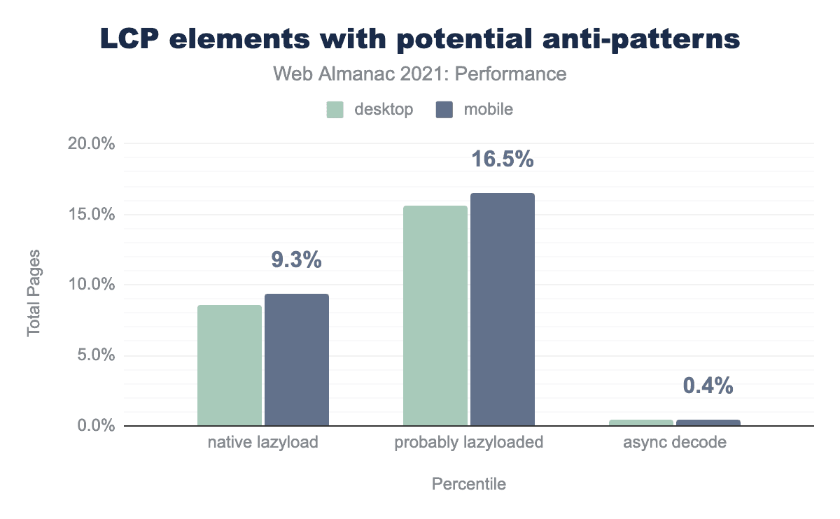 For user experience, we want LCP elements to load as fast as possible. User experience is why LCP was selected as one of the Core Web Vitals. We do not want it to be lazy-loaded as that further delays the render. However, we can see that 9.3% of pages used the native loading=lazy flag on the LCP <img> element.