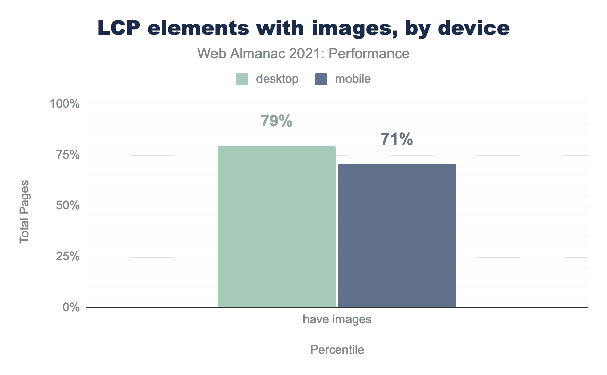 We can see that 71-79% of pages had an LCP element that was an image, regardless of HTML node. Furthermore, desktop devices had a higher rate of LCPs as images. This could be due to less real estate on smaller screens pushing images out of the viewport resulting in heading text being the largest element.