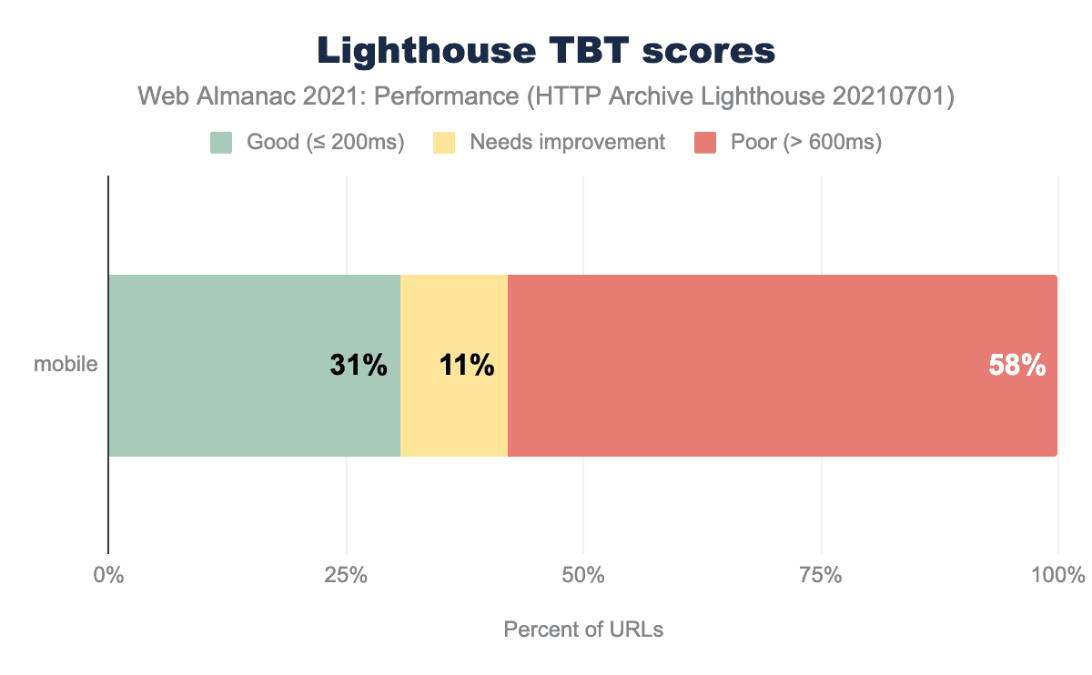 Unfortunately, TBT is not measured in the Chrome User Experience Report. But, we can still get an idea of what’s going on using the HTTP Archive Lighthouse data (only collected for mobile):