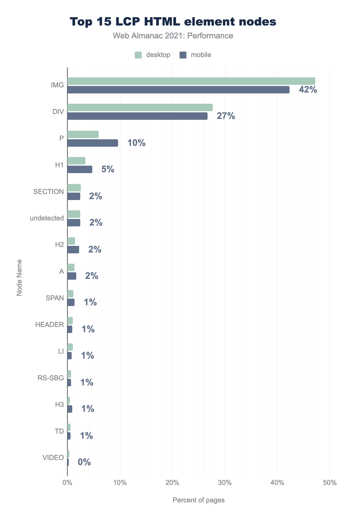 IMG, DIV, P, and H1 made up 83% of all LCP nodes (on mobile). This doesn’t tell us if the content was an image or text, as background images can be applied with CSS.