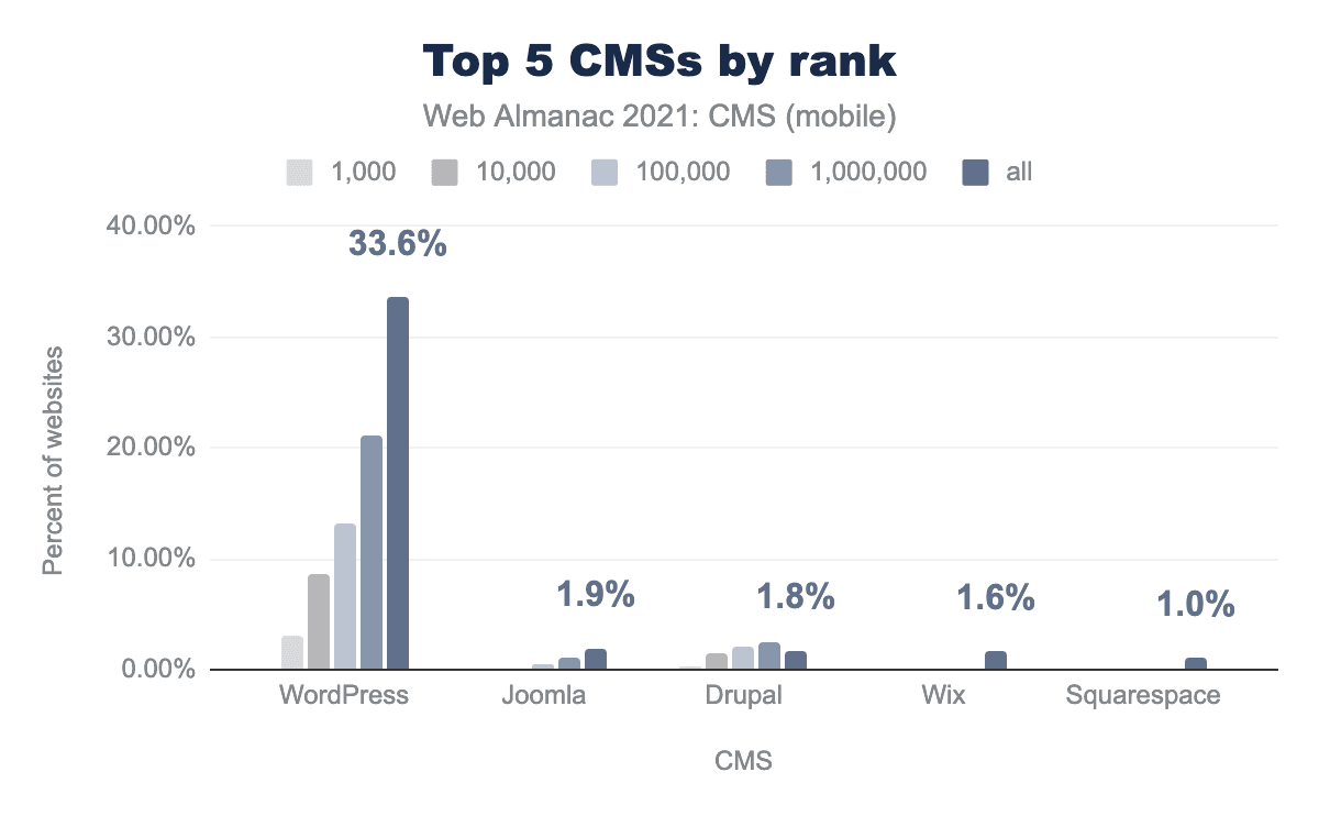 Then, if we look at the top 5 CMSs by rank, we see that WordPress has the highest adoption at for 33.6% of “all” pages: