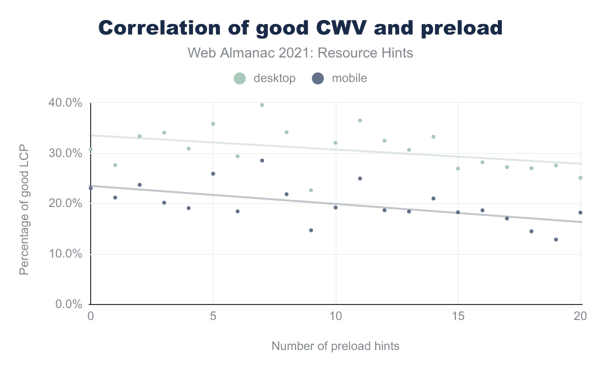 By combining a page’s Core Web Vitals scores in the CrUX dataset and the usage of the preload resource hint, you can observe a negative correlation between the number of link elements and the percentage of pages which score a good rating on CWV. The pages which use fewer preload hints are more likely to have a good rating.