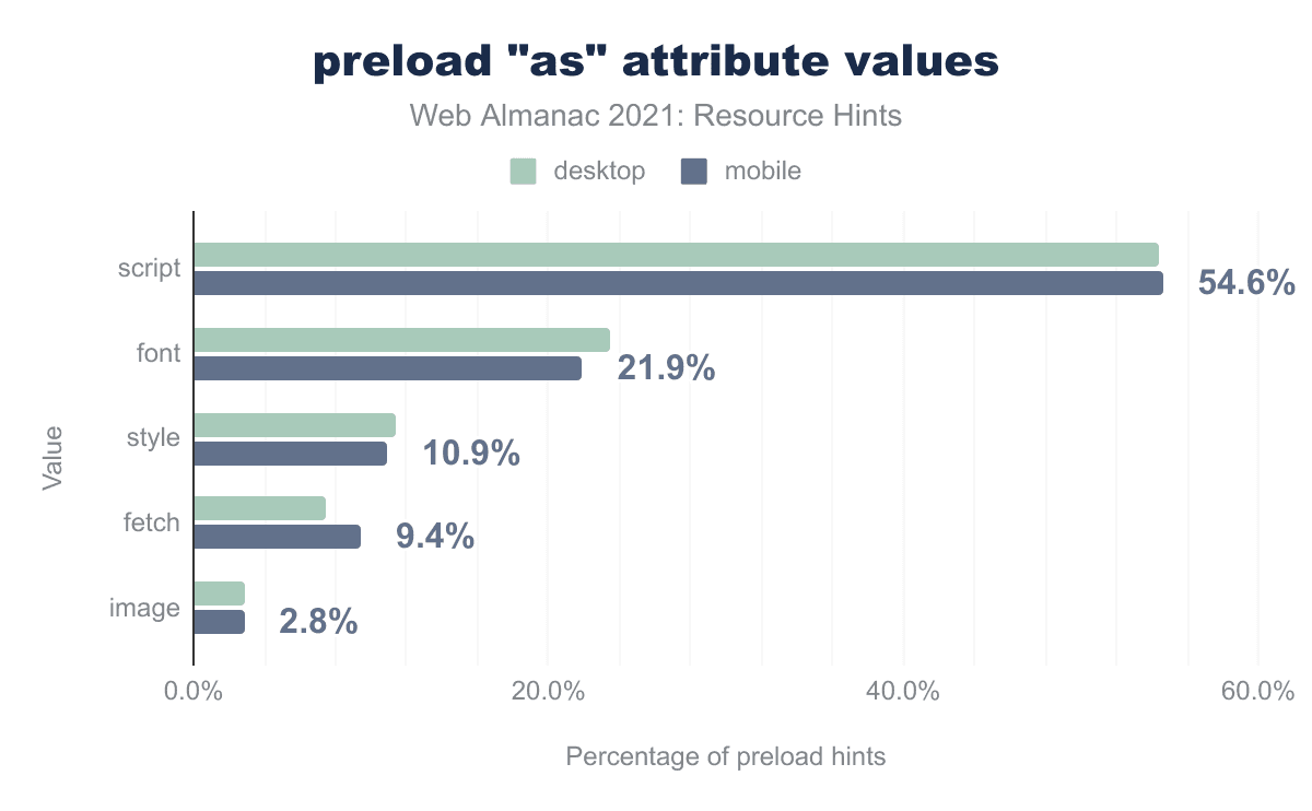 script is the most common value by a significant margin. <script> elements are usually discovered early as they are embedded in the initial HTML document, but it is a common practice to place <script> elements before the closing <body> tag. Since HTML is parsed sequentially, this means that the scripts will be discovered after the DOM is downloaded and parsed—and with more websites dependent on JavaScript frameworks, the necessity to have JavaScript load early has increased. The downside is that JavaScript resources would be prioritized over the other resources discovered within the HTML document, including images and stylesheets, possibly compromising the user experience.