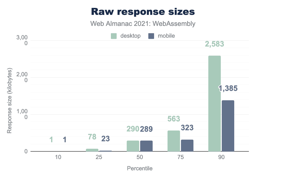 The median is at around 290 KB, meaning that half of usages download below 290 KB, and half are larger. 90% of all Wasm responses stay below 2.6 MB on desktop and 1.4 MB on mobile.