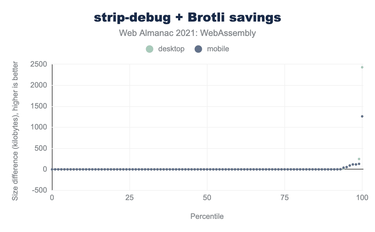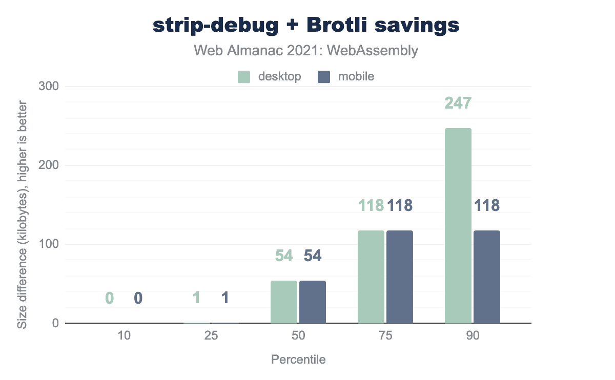 As can be seen from the graph, some file’s custom sections are negligibly small, but the median is at 54 KB and the 90 percentile is at 247 KB on desktop and 118 KB on mobile. The largest savings we could get were at 2.4 MB / 1.3 MB for the largest Wasm binaries on desktop and mobile, which is a pretty noticeable improvement, especially on slow connections.