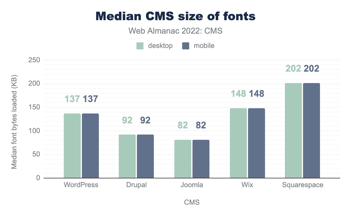 To display text, web developers often choose to use a variety of fonts. Joomla delivers the fewest font bytes, with 82 KB on mobile views. Squarespace delivers the most with 202 KB.